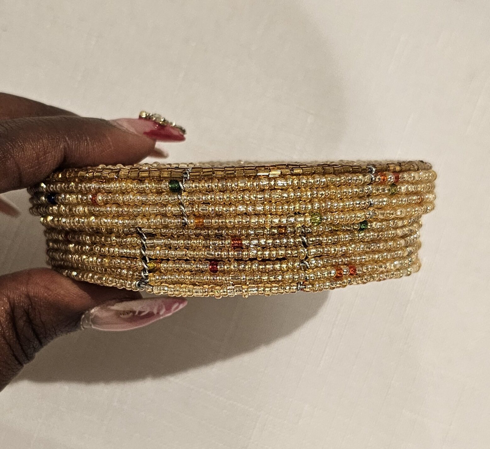 Handmade gold and multi-colored beaded coaster, intricately woven, smooth and polished, perfect for decorative or functional use.