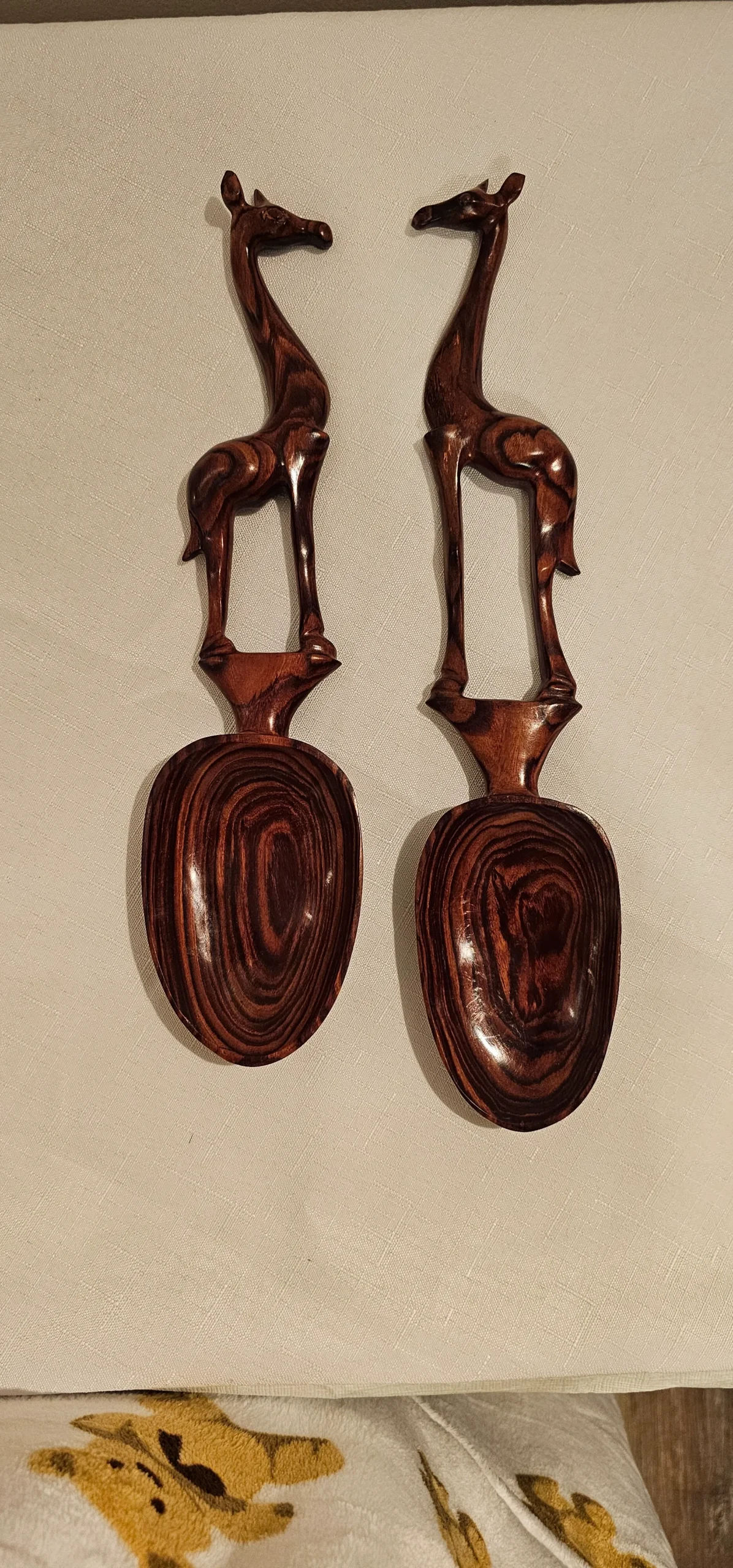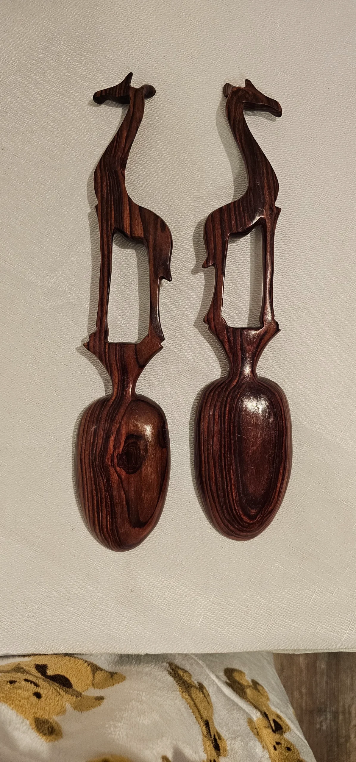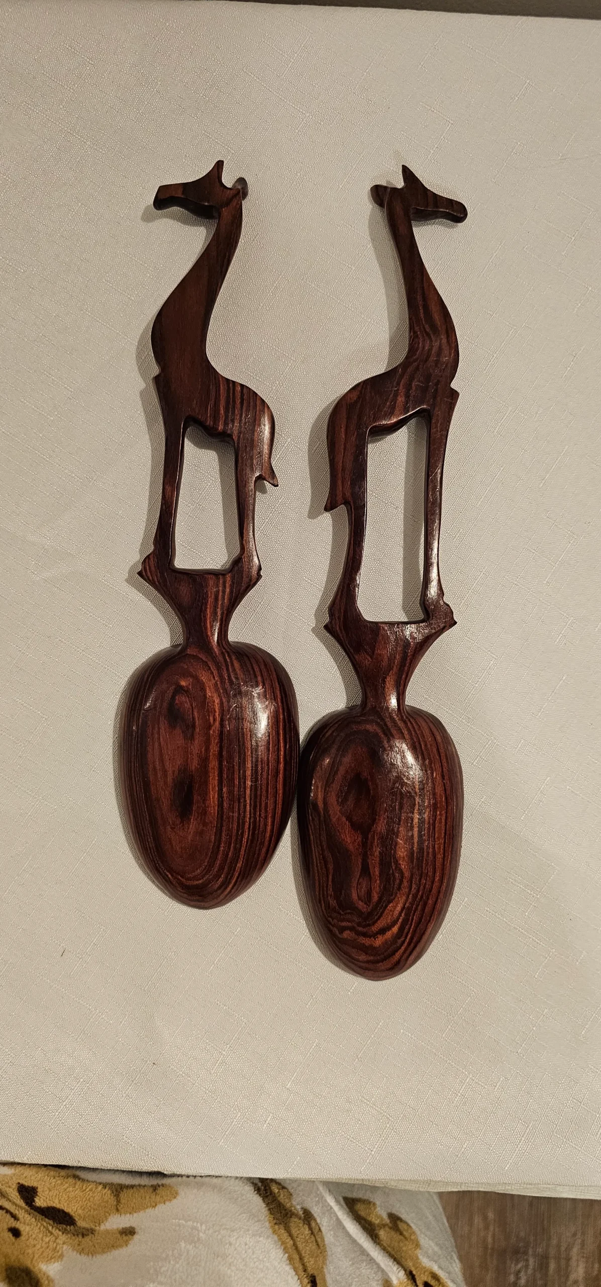1. Hand-carved wooden serving spoons, featuring elegant giraffe-shaped handles, skillfully crafted from rich, dark wood for a unique and functional addition to your kitchen or dining collection.