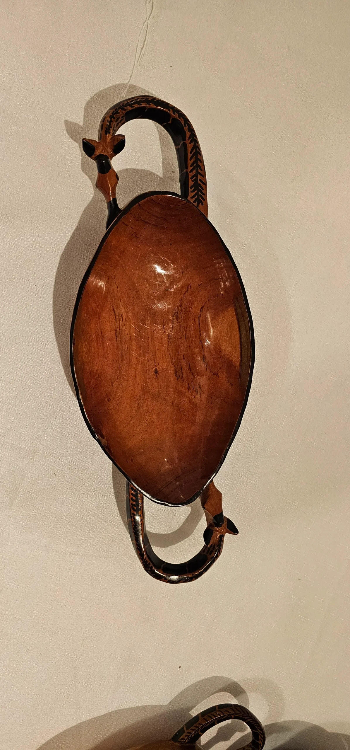 1. Hand-carved wooden serving dish with detailed giraffe-shaped handles, adorned with intricate tribal patterns, perfect for adding a touch of artistry to your dining or decor.