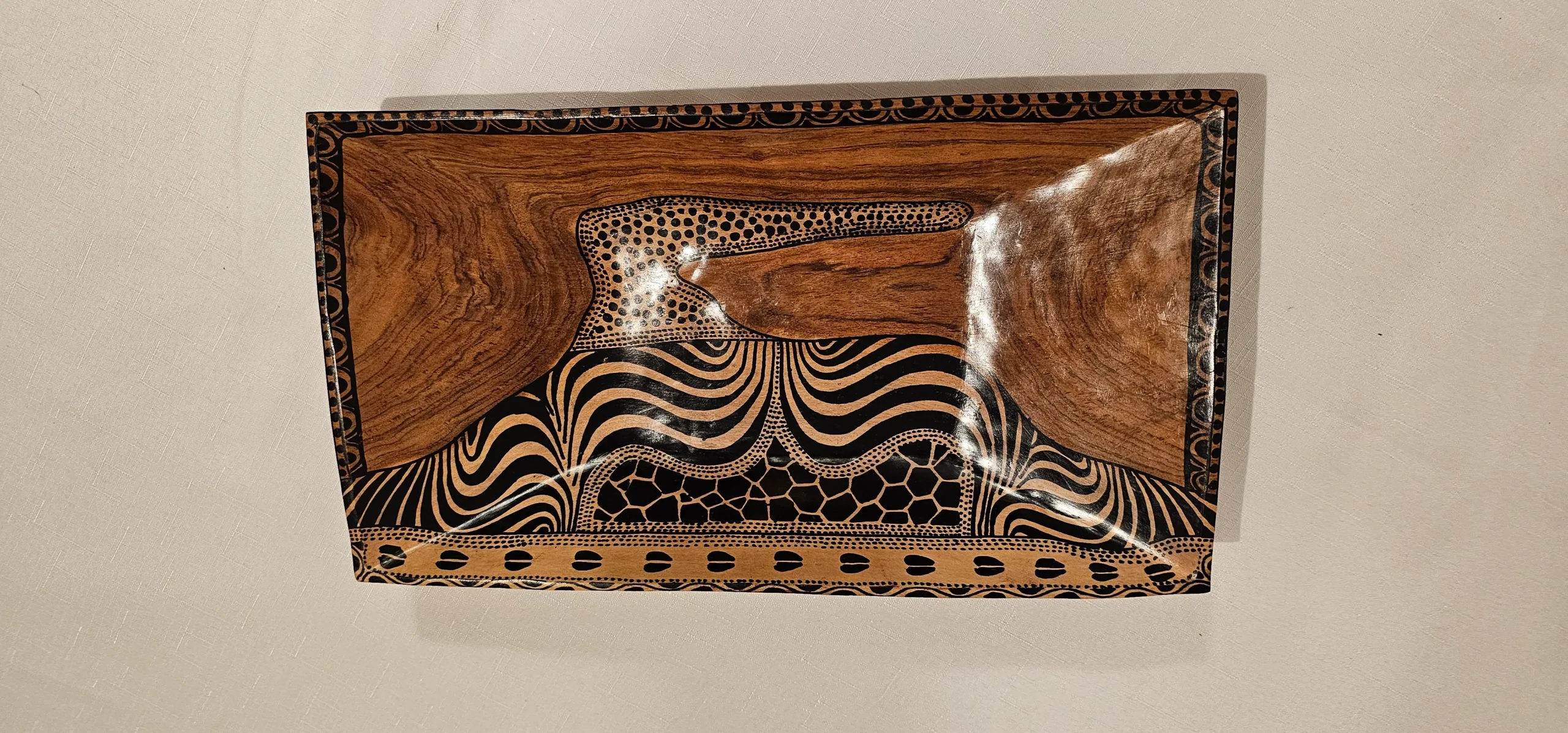 1. Hand-carved wooden tray, featuring detailed black patterns, offering a unique, artistic touch to any table or display.