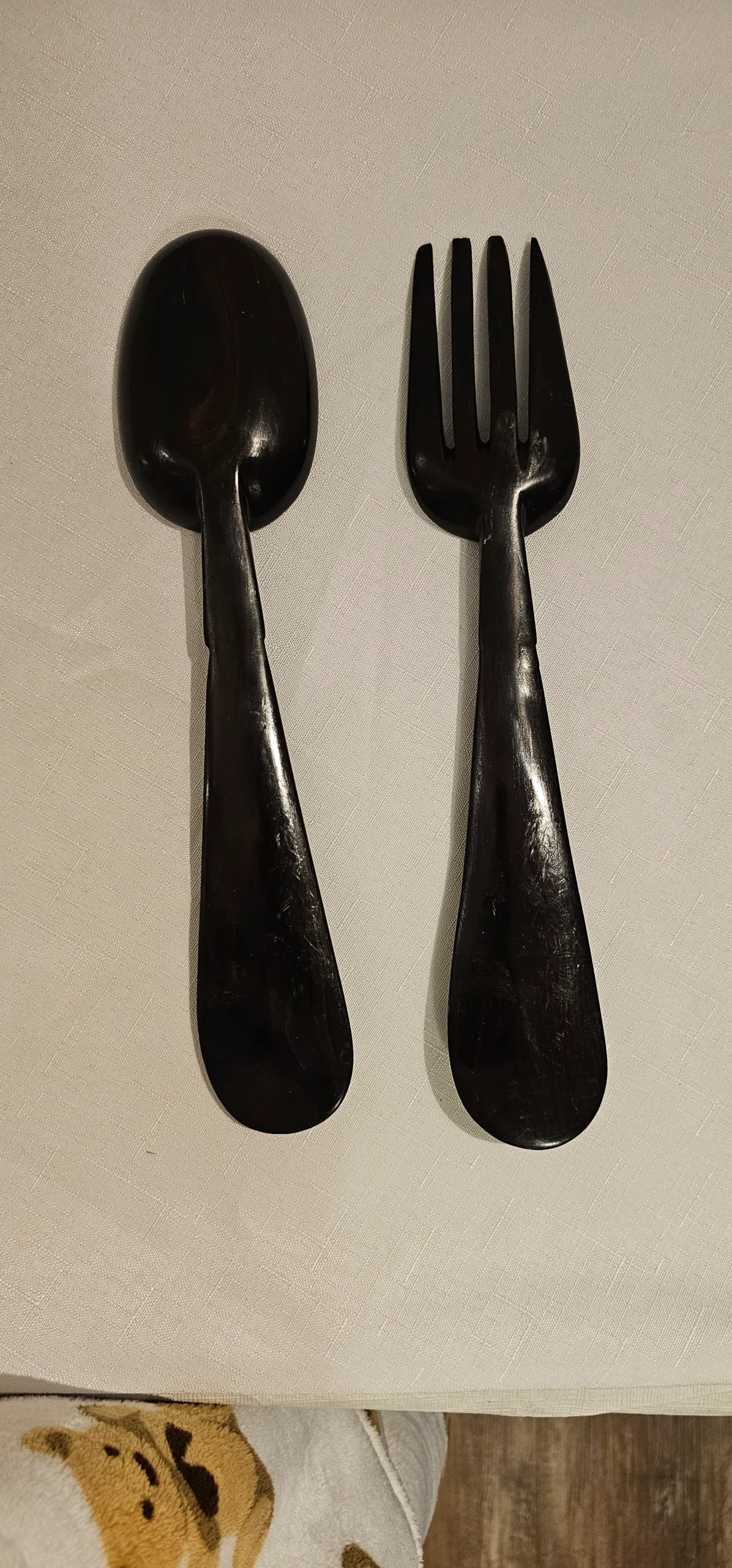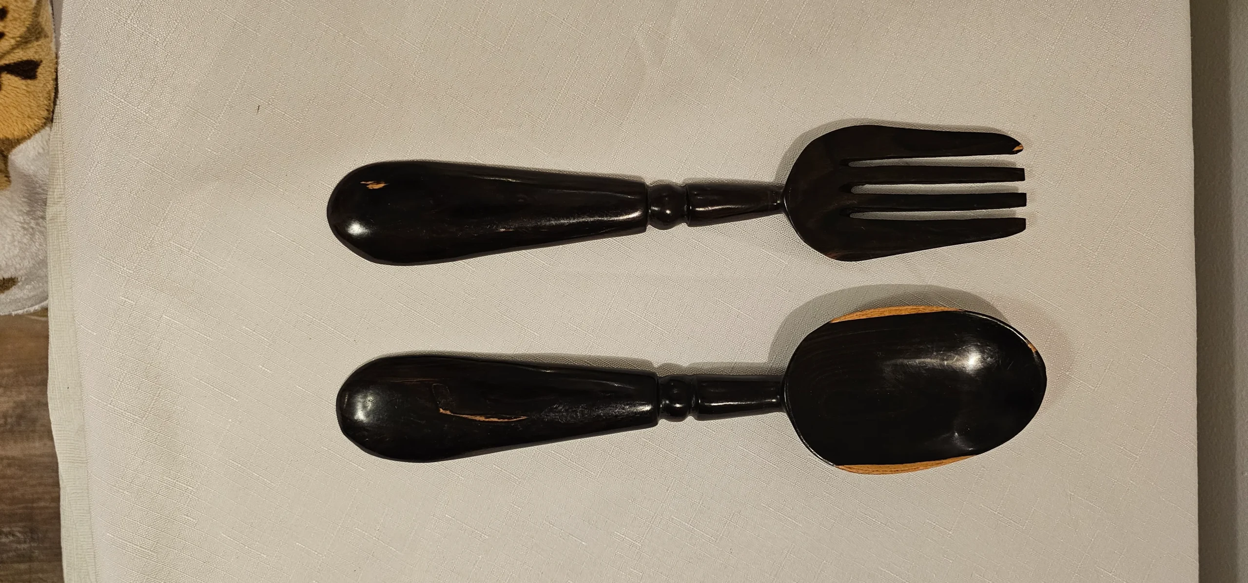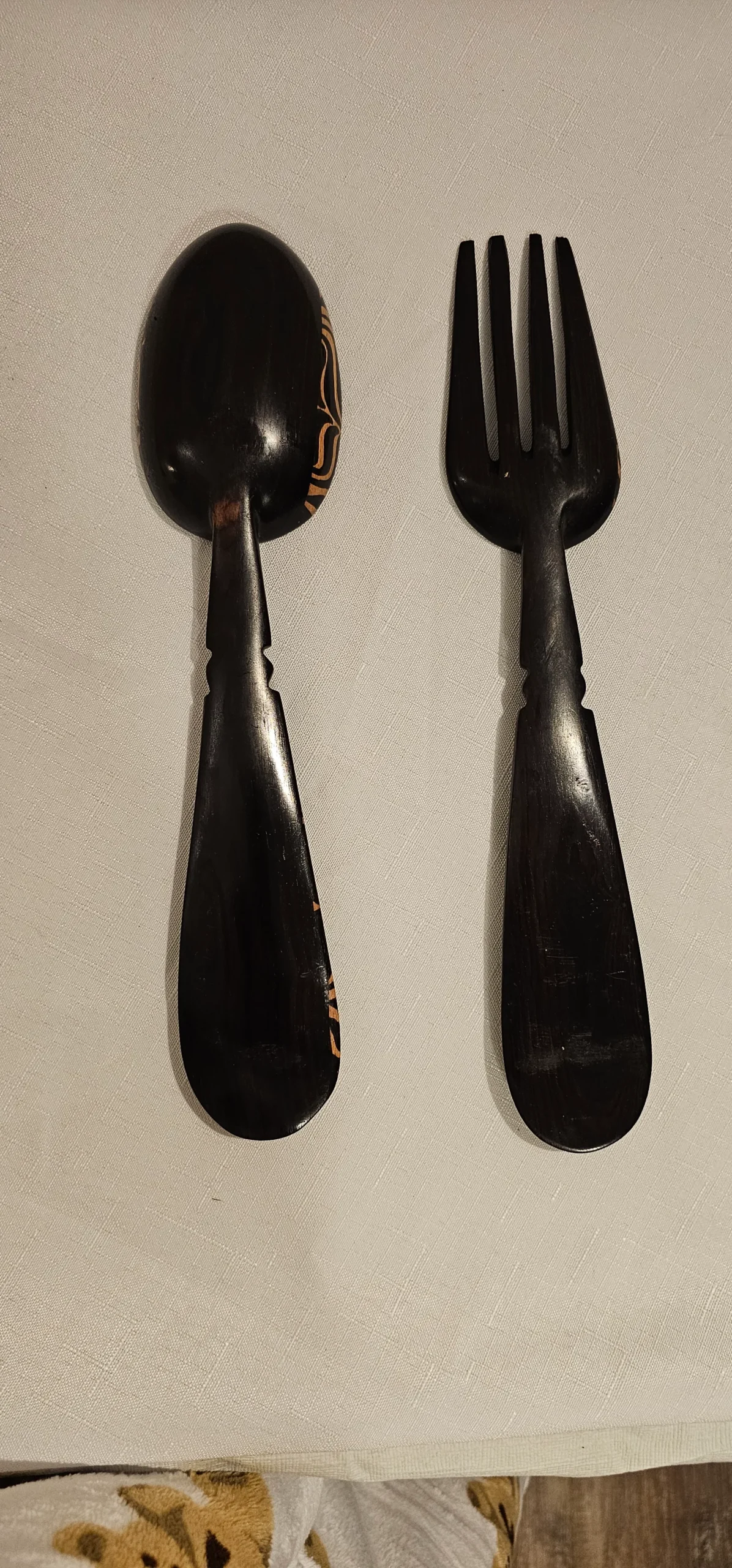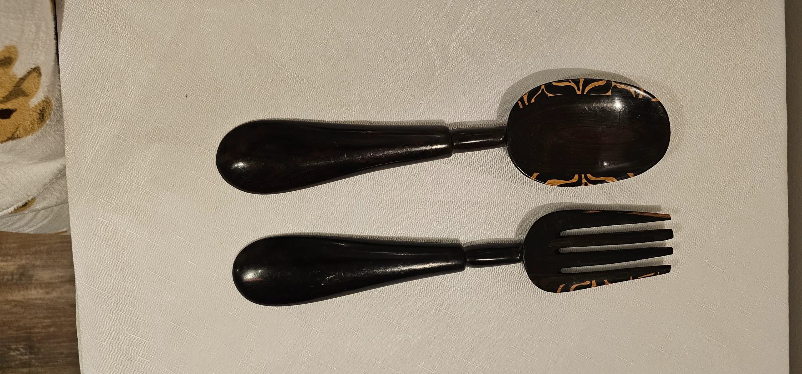 Handcrafted wooden serving utensils featuring elegant designs, with intricate detailing on the handles, perfect for adding a touch of artistry to your table setting.